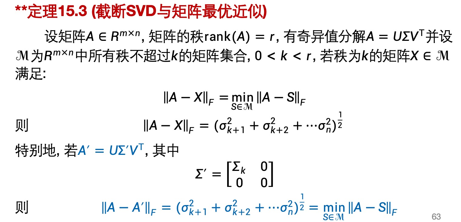 - $A_k$ 的秩为 $k$,并且 $A_k$ 是秩为 $k$ 的矩阵中在 弗罗贝尼乌斯范数意义 下 $A$ 的 最优近似矩阵