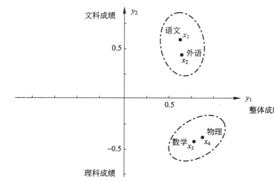 图 16.3 将原变量 $x_1, x_2, x_3, x_4$(分别表示语文、外语、数学、物理)和主成分 $y_1, y_2$(分别表示整体成绩、文科对理科成绩)的因子负荷量在平面坐标系中表示,可以看出变量之间的关系,4 个原变量聚成了两类:因子负荷量相近的语文、外语为一类,数学、物理为一类,前者反映文科课程成绩,后者反映理科课程成绩。