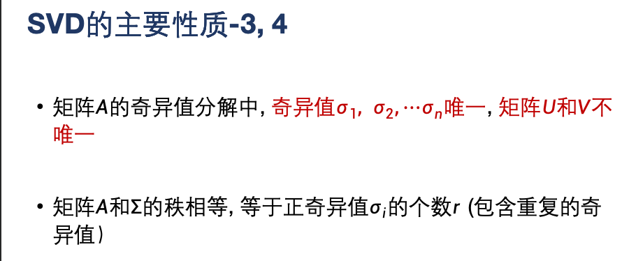 - $\Sigma$ 是唯一的,但是 $U、V$ 是不唯一的。